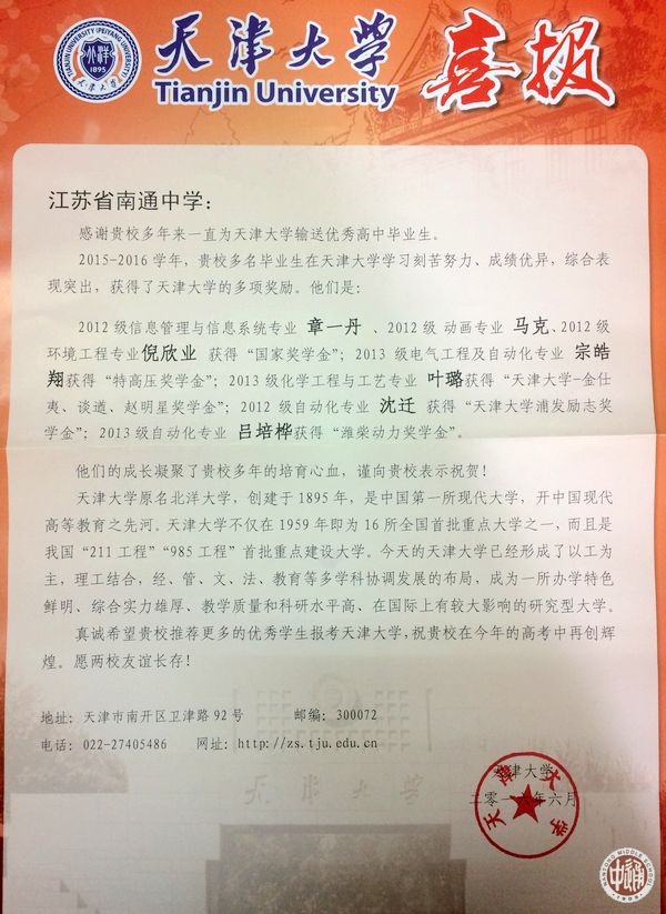 感谢信中指出,2015-2016学年度,我校多名优秀毕业生在该校学习刻苦努力、成绩优异,综合表现突出,获得了该校的多项奖励。2012级环境工程专业倪欣业、2012级信息管理与信息系统专业章一丹、2012级动画专业马克获得“国家奖学金”,2013级电气工程及自动化专业宗皓翔获得“特高压奖学金”,2013级化学工程与工艺专业叶璐获得“天津大学-金仕夷、谈遒、赵明星奖学金”,2012级自动化专业沈迁获得“天津大学浦发励志奖学金”,2013级自动化专业吕培桦获得“潍柴动力奖学金”。