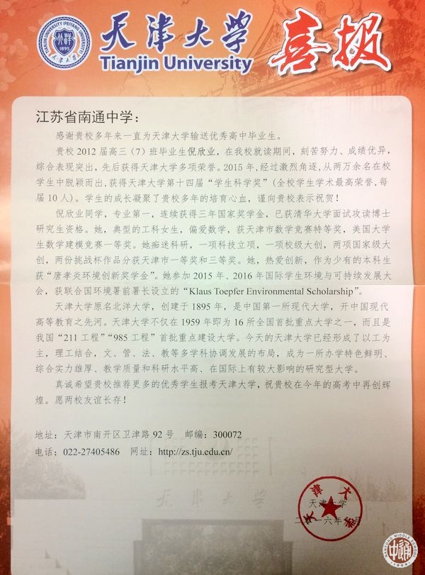 近日,天津大学向我校发来喜报,对我校多年来一直为天津大学输送优秀高中毕业生表示感谢,向我校多位校友获得嘉奖表示祝贺。