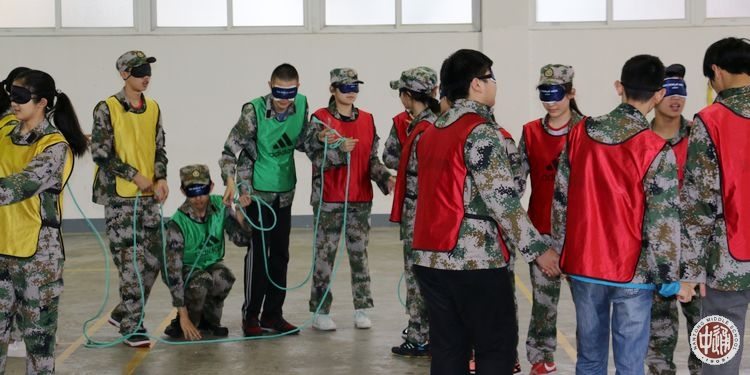 Around noon, students were asked to link 9 ropes which were randomly placed in a big hall to form a square shape with their eyes covered by eye patches in 30 minutes.