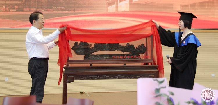 高三年级全体毕业生也向母校赠送毕业纪念品——紫檀如意雕刻工艺品。校党委朱全中书记和学生代表沈文菲共同揭开了赠礼的面纱。如意是中国传统的吉祥之物,寓意万事顺利,吉祥如意。名贵的紫檀材质与母校尊贵的地位相配;流畅的线条,饱满的造型,预示着对待学习生活热情饱满、积极向上的态度。精致的礼物表达着高三学子对母校深情的感恩和美好的祝愿。高三各科老师也通过寄语视频,表达了对学生们的热情祝贺,各班学生代表也纷纷向恩师们献上美丽的鲜花,与老师们热情拥抱。这一刻,感恩与感动的暖流在每个人的心中流淌。