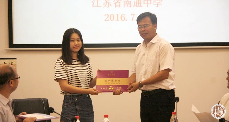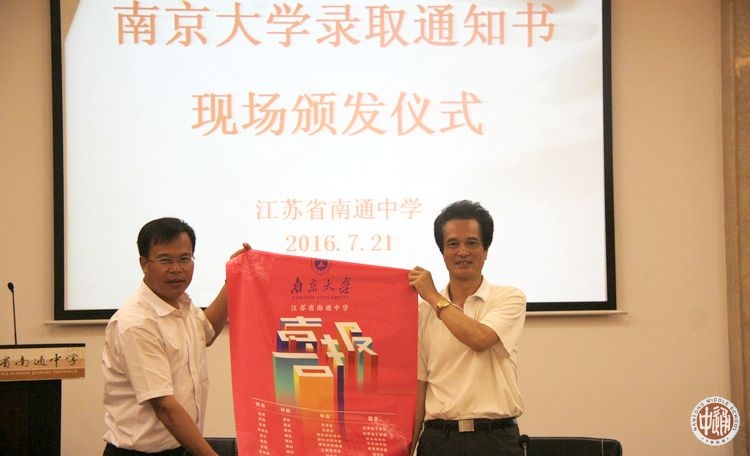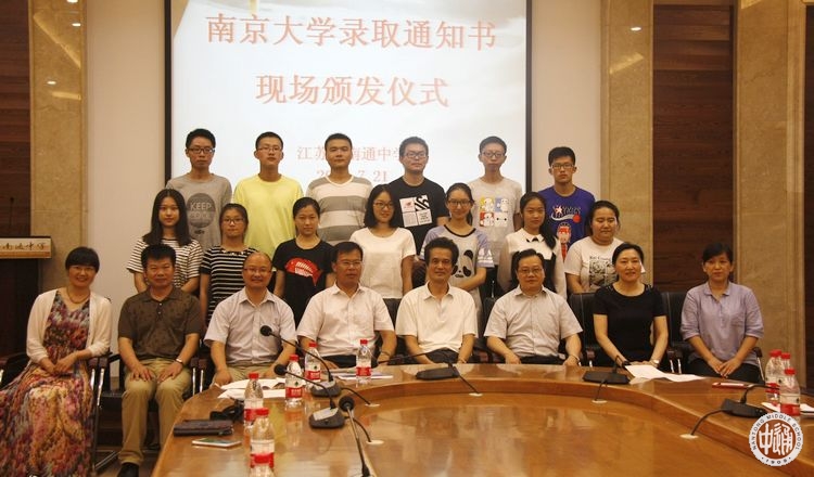 7月21日下午,南京大学校长办公室主任尹三洪、哲学系党委书记周爱群、学工处副处长蒋恩铭、物理系教授吴小山一行四人,专程来到“南京大学优质生源基地”——江苏省南通中学,为2016年录取该校的13名应届毕业生颁发录取通知书。我校校长姚天勇,副校长沈惠祥、陈建云参加颁发仪式。