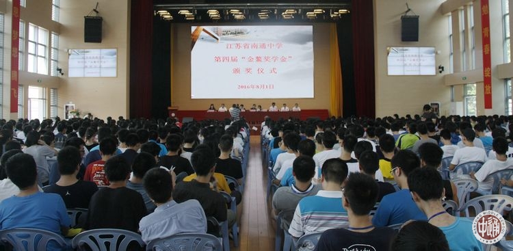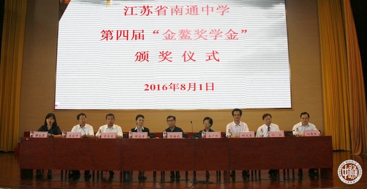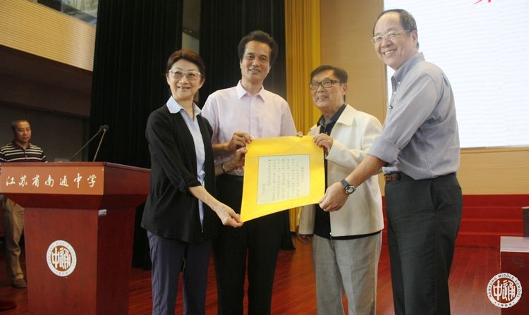 8月1日上午,第四届“金鳌奖学金”颁发仪式在学校新健雄馆隆重举行。我校校友,张謇先生嫡孙,原全国政协常委、财经委员会副主任,全国工商联常务副主席张绪武先生,张绪武先生夫人孟广珍女士,台湾程欲明学术基金会董事长沈正先生,台湾程欲明学术基金会创办人、执行董事,台湾肇明公司、明登公司董事长程文晋女士,张謇先生曾孙、省人大常委张慎欣先生,台湾程欲明学术基金会董事、台湾台橡股份有限公司董事、台湾欣铨科技公司监察人郑大志先生,申华化学工业有限公司高级顾问邵康乐先生,申华化学工业有限公司董事、总经理姜朝阳先生,市政府教育督导室副主任李友龙,我校校长姚天勇、党委书记朱全中、副校长沈惠祥等领导和嘉宾参加颁发仪式。仪式由学生处主任滕旻彦主持。全体新高三学生在现场见证了奖学金的颁发。