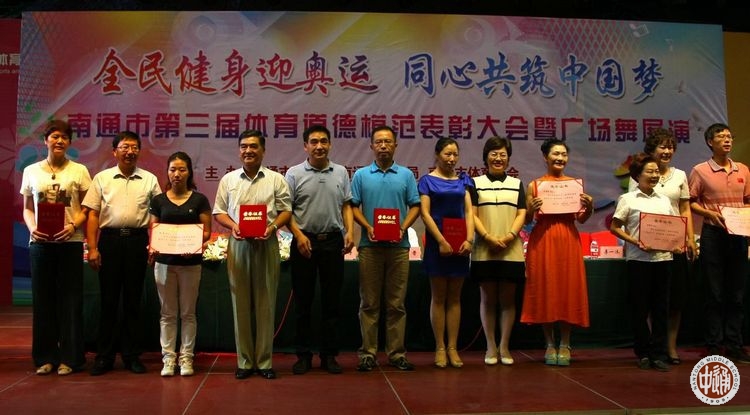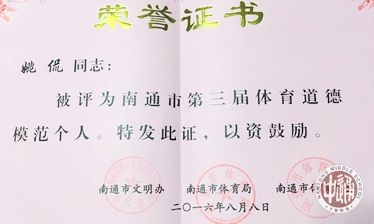 为了表彰先进,在全市进一步营造崇尚道德楷模、推动体育事业发展的浓厚氛围,8月12日下午,市文明办、市体育局、市体育总会联合开展了南通市第三届体育道德楷模表彰大会暨广场舞展演活动。活动对评选出的3个体育道德模范群体和10名体育道德模范个人予以表彰,我校姚侃老师被评为“市体育道德模范个人”。