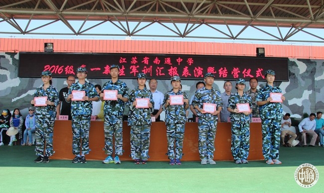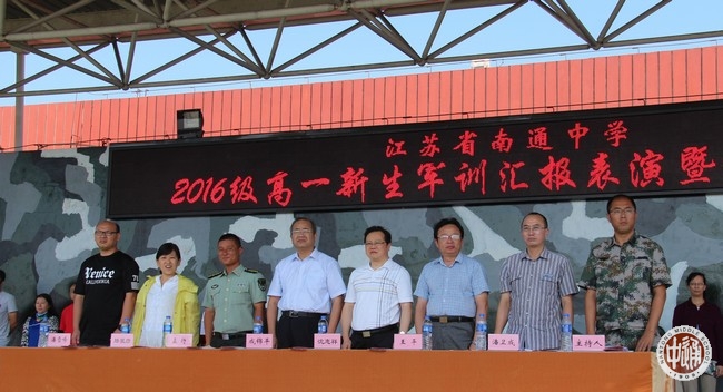 8月28日上午,我校2016级高一新生军训汇报表演暨结营仪式在如东小洋口中小学素质教育基地如期举行。校长成锦平、副校长沈惠祥、党政办主任王平、学生处主任滕旻彦、高一年级全体班主任及训练基地教官一起检阅学生一周来的军训成果。