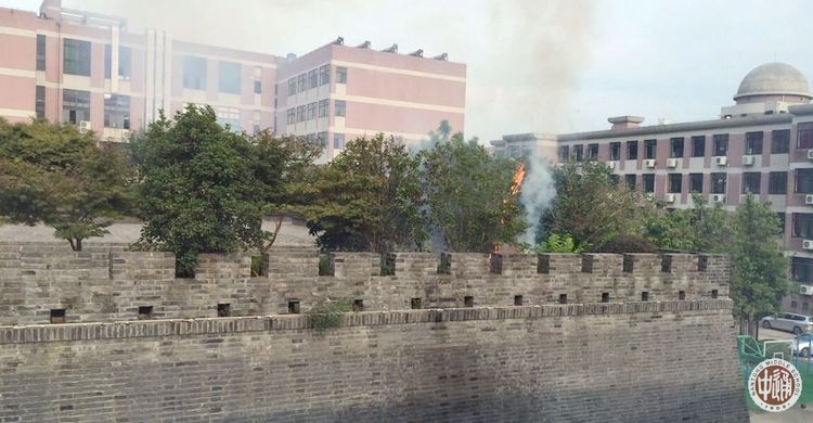 8月31日下午16:00,学校北门旁紧邻我校的北极阁突然传来噼里啪啦的声音,当班保安高芝建赶紧冲出探查,发现北极阁上方浓烟滚滚,火苗窜上树枝头。高芝建第一时间用对讲机通知微型消防站队长张鸿春并拨打119请求支援。接到报告后,张鸿春立即率领郝昌俊、陆水华等微消防站队员以最快的速度赶到北极阁,他们与当时正在现场的李建冰老师和唐志祥老师一起配合,迅速接通新体育馆的消防水带,很快将火扑灭了。随后濠河消防中队赶到,对火灾现场做了最后的火星处理。