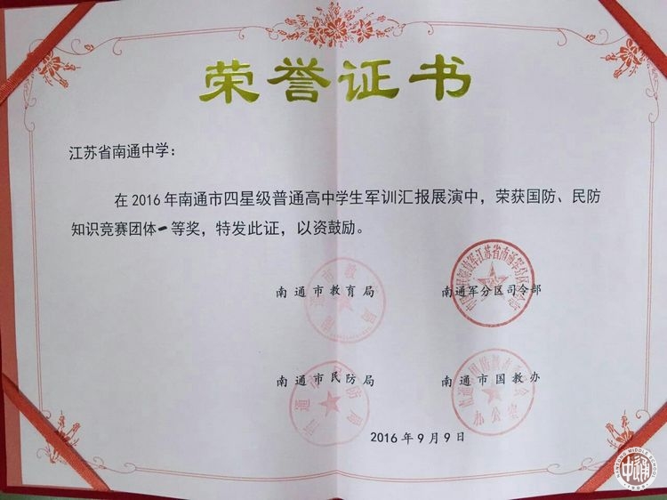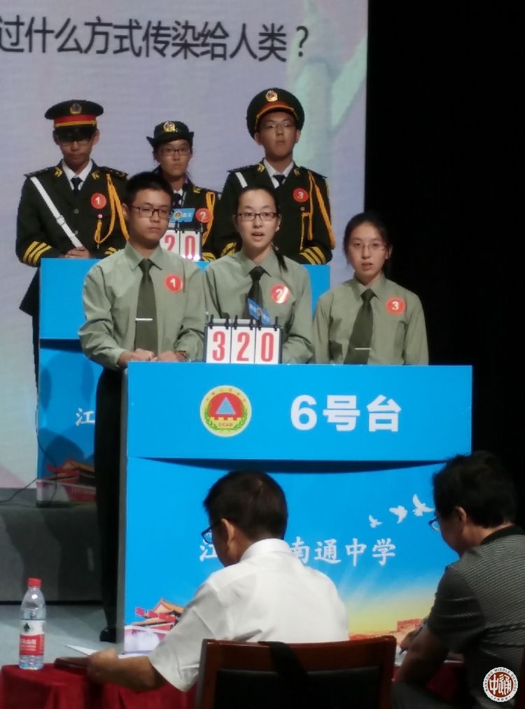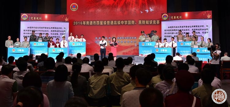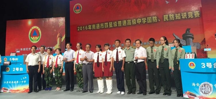 9月9日,由市教育局、市军分区司令部、市民防局、市国教办联合举办的南通市四星级普通高中学校国防、民防知识竞赛在南通电视台演播大厅举行,来自全市24所四星级普通高中学校的代表队展开了激烈的角逐。这项赛事也是2016年南通市四星级普通高中学生军训汇报展演的项目之一。代表我校参赛的是来自高一(10)班的马骁、高一(3)班的陈璐宁、高一(12)班的杜林鸽、高一(14)班的徐政昊以及高一(6)班的邵波等5位同学。