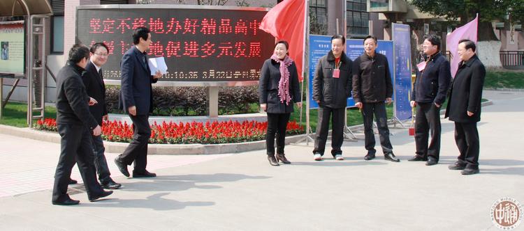 参加本次测试的考生成绩将按A、B、C、D四个等级评定。该成绩将作为今年高校部分专业录取的依据之一。下图为3月26日上午市教育局、市招生办领导来我校考点检查测试工作,我校考点主任校长姚天勇、副校长许建平等陪同巡视。