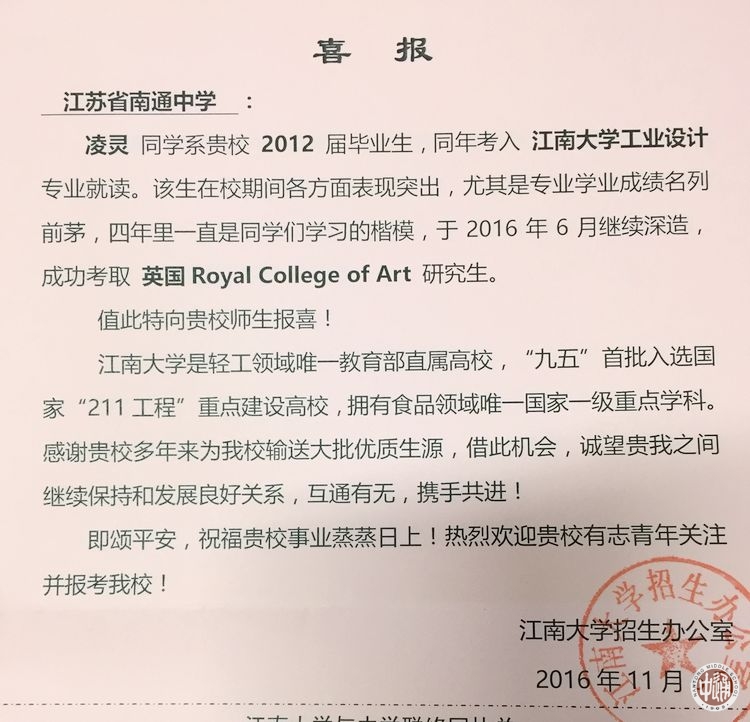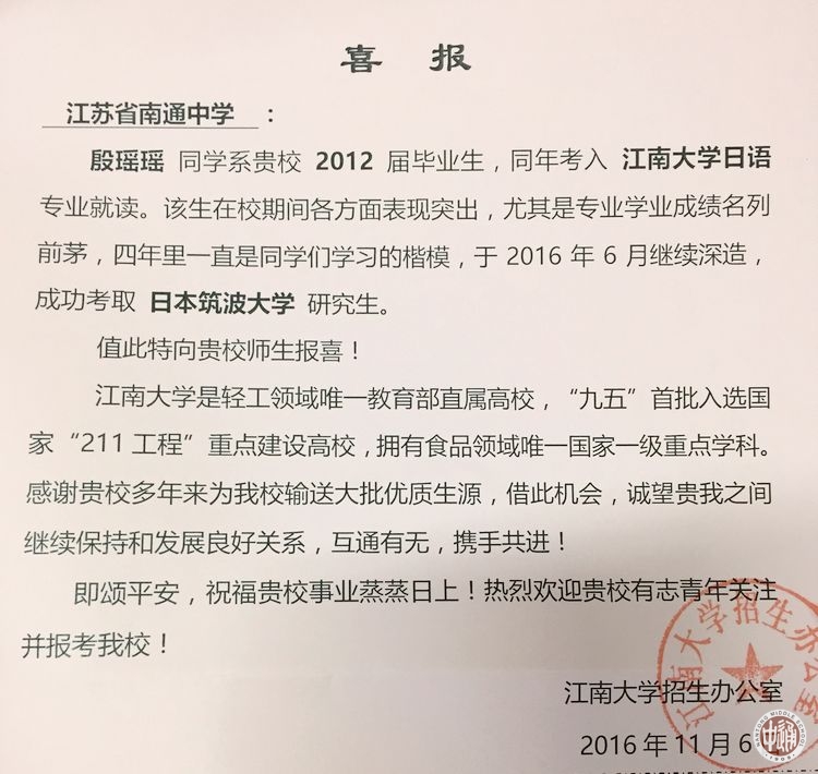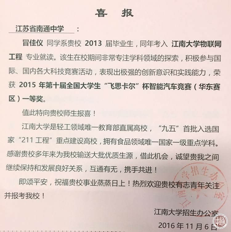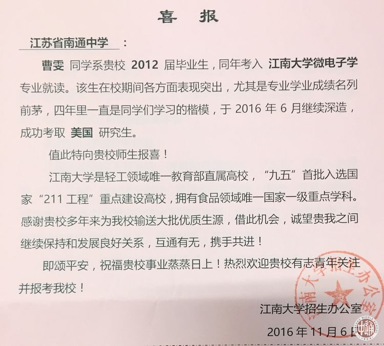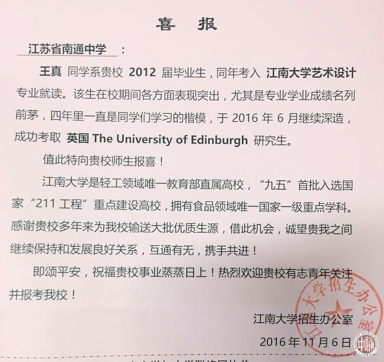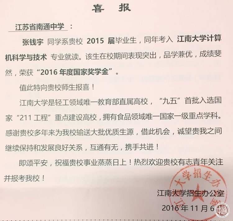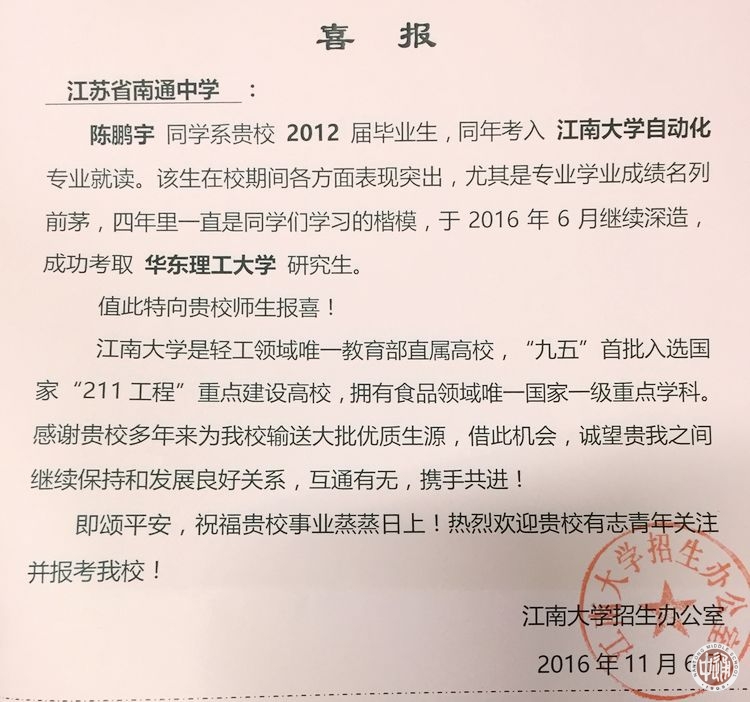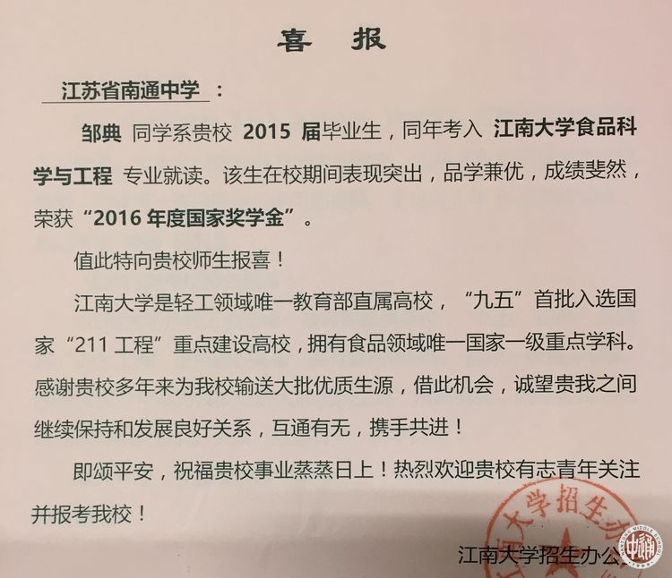 近日,江南大学向我校发来喜报,感谢我校多年来为该校输送大批优质生源,诚愿两校继续保持和发展良好关系,互通有无,携手共进。