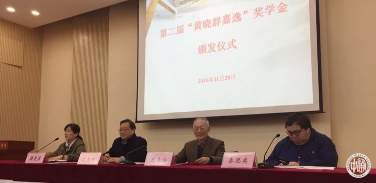 11月28日下午,我校在科学楼报告厅举行第二届黄晓群嘉逸奖学金颁奖仪式。前侨联主席尤来宗先生、黄晓群嘉逸奖学金创立者秦思奕先生以及黄晓群女士部分昔日的同窗好友莅临会场。副校长沈惠祥参加仪式。活动由学生处滕旻彦主任主持,全校各社团和社区活动负责人及各班代表参加活动。