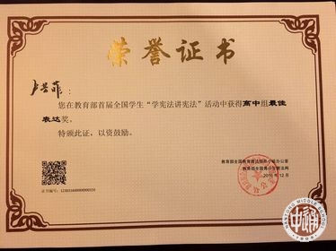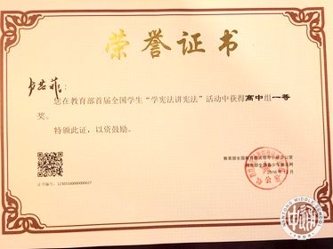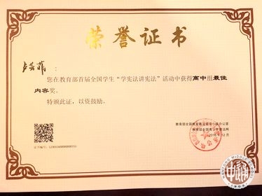 在今年“国家宪法日”到来之际,从北京传来喜讯,我校高一(6)班卢芳菲同学在12月1日落幕的首届“学宪法 讲宪法”活动全国总决赛中一路过关斩将,勇夺宪法演讲比赛全国高中组一等奖,并获得全部四个单项奖中的“最佳内容”和“最佳表达”两项大奖。