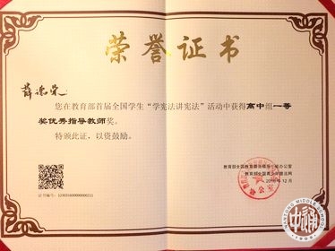 作为一次对宪法知识普及、宪法精神宣传的专业性比赛,卢芳菲获得的个人荣誉背后也凝结着团队合作智慧结晶。语文学科薛德荣老师全程陪同,精心指导,也获得了全国高中组一等奖优秀指导教师奖;政治学科周建民、徐金祥等老师积极提供对专业知识的解读分析;校团委还组织语文学科、校周一讲团、高二文科班等多位师生精心完善演讲文稿。这一切充分体现了通中人团结协作、精益求精的进取风貌。