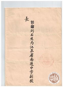 刘石生老师生于1908年,2001年辞世,享年93岁。老师是清华大学第九届化学系毕业生,治学严谨;1956年被任命为江苏省南通中学副校长,深受南通中学学子们的尊敬和爱戴。