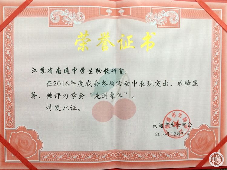 生物教研室获得“先进集体”荣誉称号 来源:本站原创 发布时间:2016-12-26 10:59:16 浏览次数: 次 【字体:小 大】 2016年度,江苏省南通中学教研室在省级生物学科骨干教师培训、学科奥林匹克竞赛、高考、学测以及市生物学科基地组织的一系列活动中,表现突出,成绩显著,被南通市生物学会评为“2016年度先进集体”。 分享到: 【打印正文】