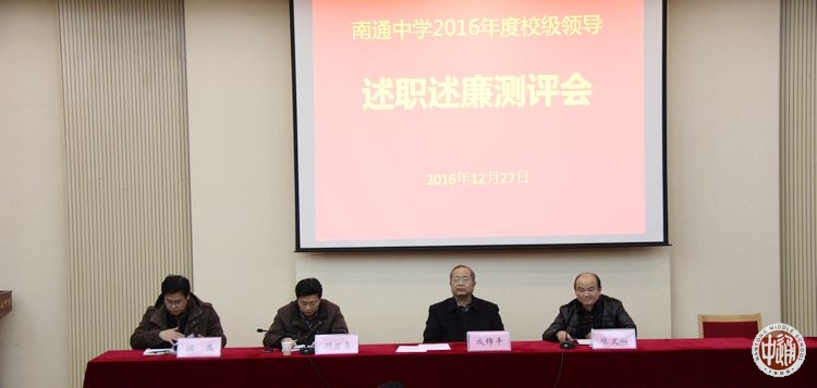 12月27日下午,学校在科学楼三楼报告厅召开2016年度校级领导述职述廉测评会。市委组织部企事业干部处顾万勇处长、教育局组宣处顾彧处长出席会议。全体办公会成员、学科主任、年级主任、教代会代表参加会议。会议由校党委书记陈文辉主持。