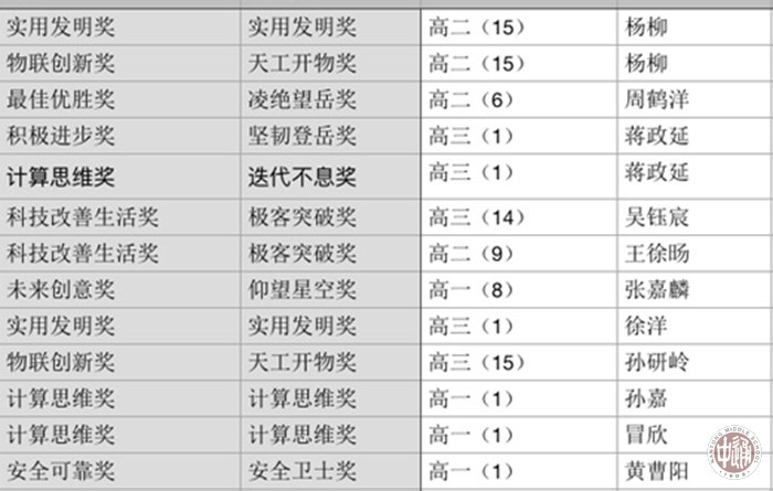 今次颁奖11名具科技创新方面特长并初有成果的同学获得奖励。仪式上往届校友、科技导师们对同学们的作品一一作了认真的点评。导师认为,周鹤洋完整实现了一整套智能校园管理系统,出色的代码能力让所有导师都很惊讶,全票通过推荐为最佳项目,获得凌绝望岳奖;吴钰宸提出了云智能的自行车码表,将硬件端的自行车码表,心率测试和服务器连接起来,这个出色的创意获得了极客突破奖;王徐旸则创新性的提出了用手势控制音乐播放的想法,并设计了系统架构,也荣获极客突破奖,等等。