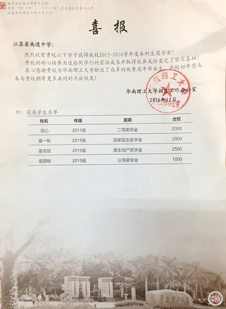 近日,华南理工大学向我校发来喜报。对我校顾沁(二等奖学金)、姜一帆(国家励志奖学金)、姜奕璠(昌生地产奖学金)、唐嘉敏(三等奖学金)获得该校2015-2016学年度本科生奖学金表示热烈祝贺;对我校向该校输送众多优秀高中毕业生表示衷心感谢;殷切希望未来与我校拥有更多共同的杰出校友!