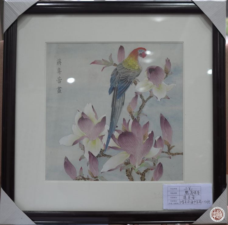下图是高一年级女生蒋弈蕾参展的工笔画作品《鹦鸟鸣春》