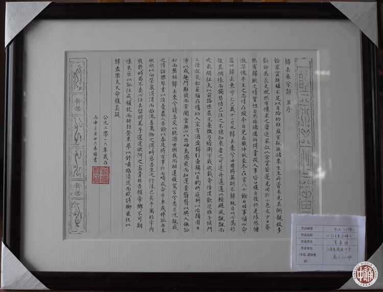 下图是高二年级男生葛易谙参展的书法作品《归去来兮辞》