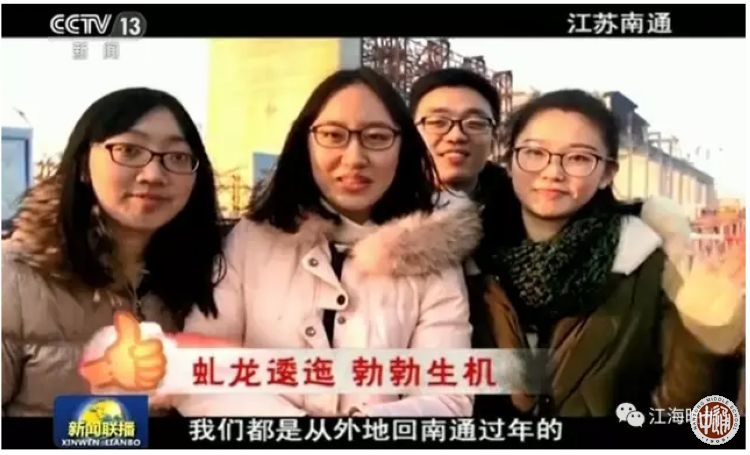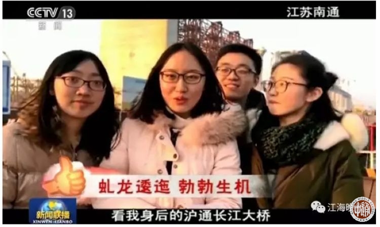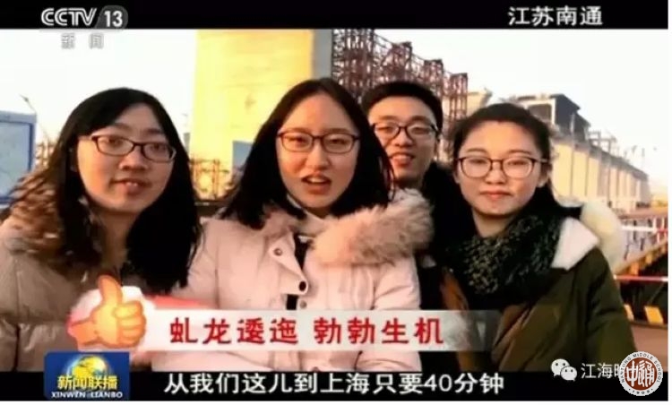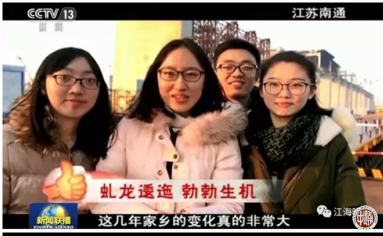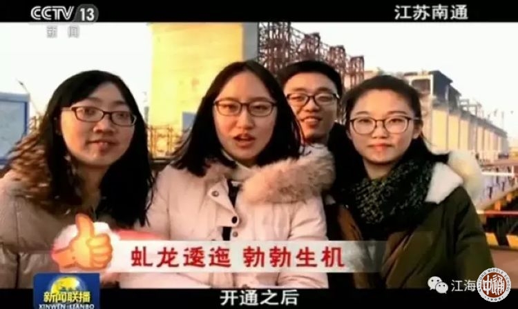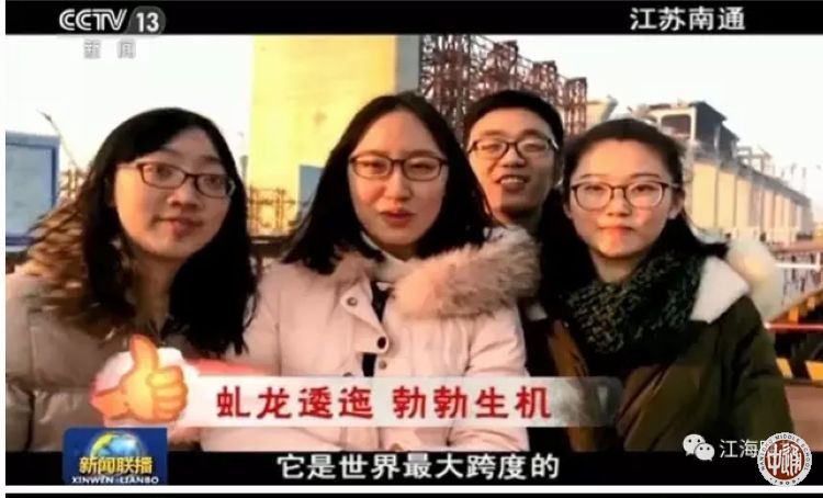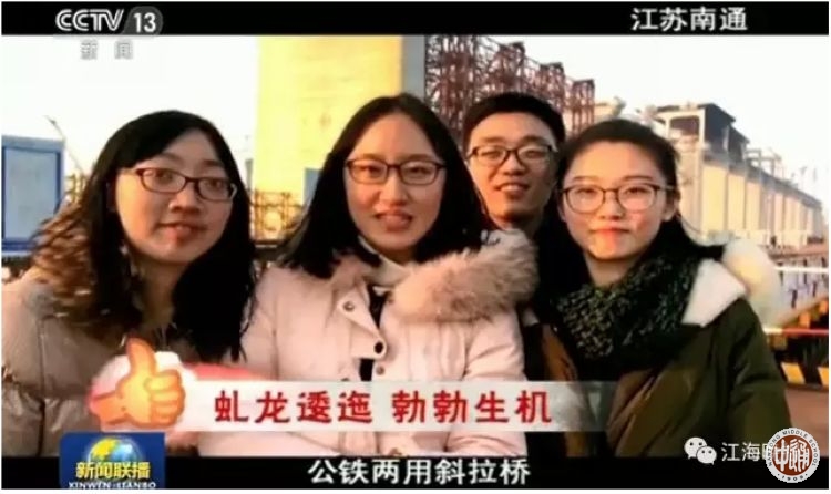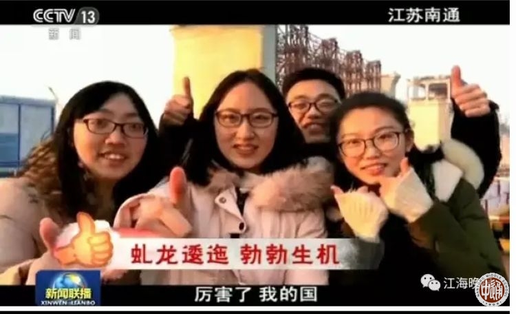 今年春节期间,“央视新闻”开展了【央视征集:#厉害了!我的国#】征集活动。活动让回家想过年的人们,拍下身边最棒的中国人、最牛的中国造、最震撼的中国工程。我校2013届校友周歆圆、陈嘉瑶、赵超、洪在妍拍摄了一组反映南通在建的沪通长江大桥的视频,大年初一在中央电视台新闻联播播出。