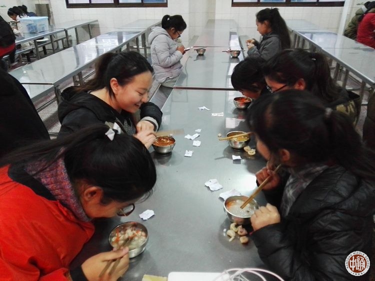 晚6点,藏族特色的“古突”年夜饭开始。同学们各自盛上一碗热气腾腾的“古突”,三五成群围坐在一起,先啐上一口浓汤,满满的家乡的味道,舀上一勺“古突”,大口咀嚼,再挑上碗里那个最大的“古突”,轻轻咬那一口,露出小纸片,有点小紧张的取出,周围的伙伴拥上来一起读出,彼此大笑一场。同学们还热情的向特意赶来的沈惠祥副校长介绍他们所吃“古突”里小字条上藏文的字意和其代表的寓意,这一刻幸福与快乐洋溢在同学们的脸上。