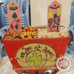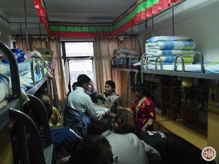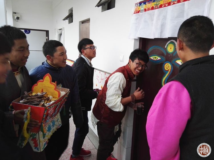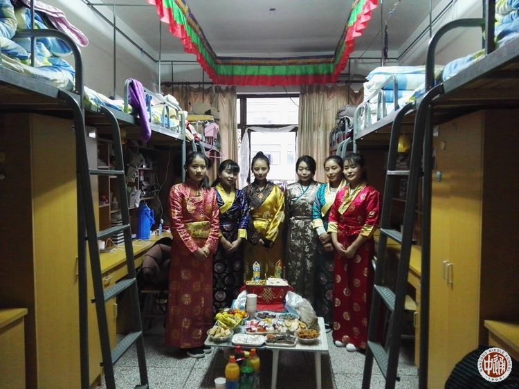 五彩的经幡高高挂起,艳丽的藏装美美穿起,各色手制切玛满满的摆起,欢快的藏歌畅快的唱起,奔放的锅庄舞热烈的跳起!2月27日,藏历火鸡年的第一天,学校公寓大院内充满了浓浓的藏历新年的味道!7点钟,藏族新年习俗之串门拜年活动开始。一大早,西藏生以宿舍为单位四五人结伴,手捧自制的吉祥切玛,端着浓浓的酥油茶,提着满盘的藏式糕点糖果和牦牛肉,到一个个宿舍串门拜年。被造访的同学会热情的打开房门,挑开门帘,迎接拜年的伙伴们的到来。他们用手捏取切玛里的一点糌粑向天空抛洒,互道祝福,并用宿舍里准备好的藏式小点心和饮料款待造访者。一声声“扎西德勒”,一阵阵叫好欢笑响彻在宿舍楼内。