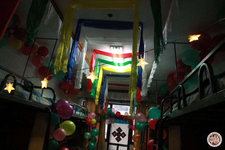 新年里的每个宿舍都经过了藏族学生们的精心布置:门上或用彩笔绘制了美丽的民俗图样,或挂上藏族风格的门帘;室内挂上吉祥的哈达和彩帘,扎上彩色的气球;室内正中摆上小桌,桌前铺上毛毡,桌上放置切玛和各色糖果、糌粑、牦牛肉、酥油茶的食品,整个宿舍既饱含独具特色的藏民族风情,又张显着浓浓的新年喜庆。参观的老师和同学饶有兴趣的欣赏着、点评着,选出他们心中的“最美藏俗宿舍”。