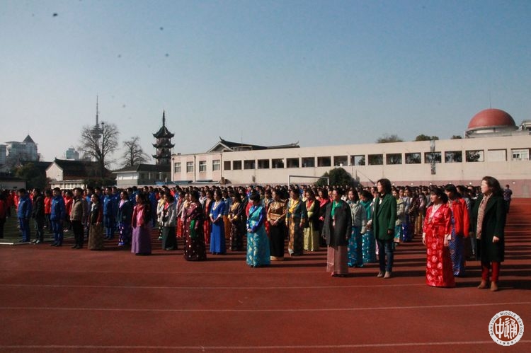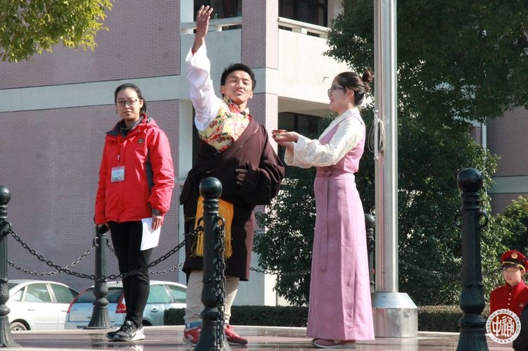 9点30分,全校周一升旗仪式。260余名西藏班同学身着藏装参加全校仪式。当五星红旗冉冉升起时,藏族同学们大声唱着国歌,阳光映照下的他们是如此的自信和灿烂。