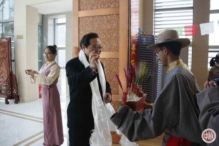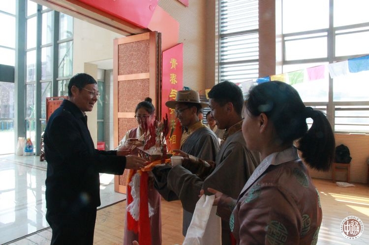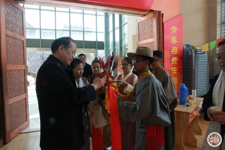 活动伊始,我校校长成锦平、副校长刘忠保、副校长沈惠祥步入体育馆给藏族孩子们拜年。几位藏族同学们手捧“切玛”和银质酒杯迎上,以藏族传统的新年礼节欢迎校长们的到来。一位藏族学生手捧“切玛”敬献给成校长,恭请成校长为“切玛”系上吉祥哈达,为新的一年祈愿祝福。同时请校长用手捻起一些糌粑向空中抛撒三下,尔后往自己嘴里放进一点;一名藏族女生再敬上一杯酥油茶,请成校长用无名指蘸些酒杯中的酥油茶轻洒三次,并捧起酒杯喝口浓香藏茶,祝福吉祥如意、身体健康;最后敬献上洁白哈达和装有藏族小吃的果盘。这套藏族礼仪正是藏历新年时藏族人每家都必须的风俗,让每一位前来拜年的老师们感受着藏族文化的独特魅力。