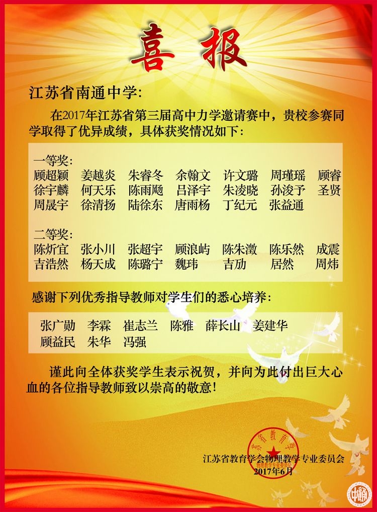 喜 报 来源:本站原创 发布时间:2017-06-15 17:20:01 浏览次数: 次 【字体:小 大】 喜 报 我校学生参加2017年江苏省第三届高中力学邀请赛,获得优异成绩。今天组委会发来喜报,再次向全校师生报喜。 分享到: 【打印正文】