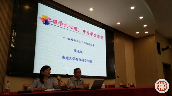 下午南通大学教育科学学院副院长、沈永江教授作《把握学生心理,开发学生潜能》专题讲座。沈教授通过自己多年的班主任经历和丰富的教育个案的介绍,深入浅出地和大家分享班主任工作的方法和艺术,让大家进一步认识到建立师生良好关系的重要性、让学生信服教育引导的必要性,从而更好的开发学生的潜能,让每一个学生都能得到更好发展。