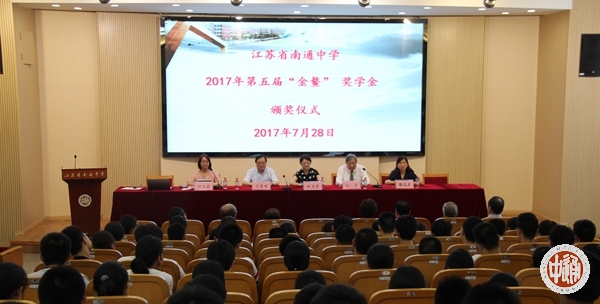 7月28日上午,2017年“金鳌奖学金”颁发仪式在科学楼三楼报告厅隆重举行。台湾程欲明学术基金会董事长沈正先生;台湾程欲明学术基金会执行董事、台湾一粒麦子基金会董事、台湾肇明公司、明登公司董事长程文晋女士;台湾程欲明学术基金会董事、台湾台橡股份有限公司董事、台湾欣铨科技公司监察人郑大志先生;台湾程欲明学术基金会董事王渡女士;台湾阳明大学医学院外科教授、台湾台北医学大学双和医院主任医师潘宏基先生;台湾程欲明学术基金会董事、台湾科技大学电子工程系特聘教授李三良先生;台湾程欲明学术基金会顾问、申华化学工业有限公司前总经理邵康乐先生;台湾程欲明学术基金会顾问、申华化学工业有限公司董事、总经理姜朝阳先生;台湾程欲明学术基金会秘书林宜燕女士;台湾程欲明学术基金会干事(南通)、台橡(南通)实业有限公司财会部彭怡和先生,及我校副校长沈惠祥、学生处主任滕旻彦等出席了颁发仪式,仪式由学生处副主任邱允莉主持。新高三全体学生参加活动,活动实况向班级直播。