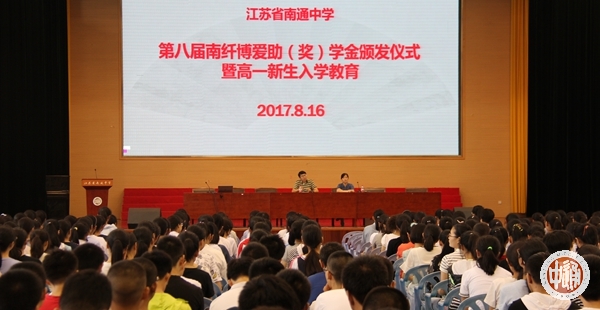 8月16日上午,我校“第八届南纤博爱助(奖)学金颁发仪式暨高一新生入学教育”在新健雄馆隆重举行。南通醋酸纤维有限公司工会主席韩振武、办公室主任赵云峰,南通市红十字会筹资赈济部副部长朱燕,我校校长成锦平、副校长沈惠祥出席颁发仪式,并为获得一、二等奖学金以及助学金的44位高三优秀毕业生颁奖。活动由学生处副主任邱允莉主持。