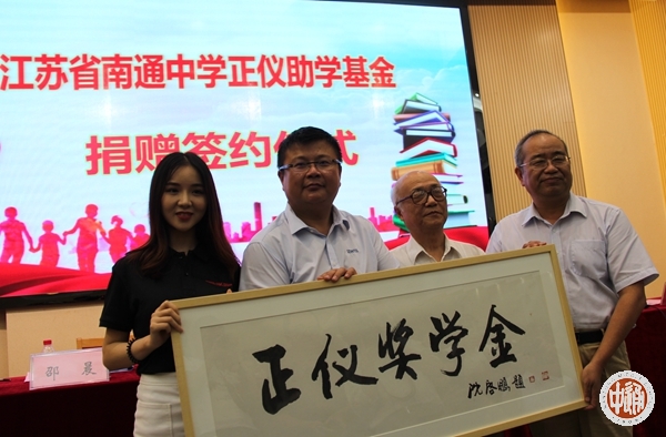 苏州世茂生物科技有限公司创始人邵晨先生、总裁吴林娟女士,在南通市慈善总会副会长兼秘书长王勇见证下,定向捐赠南通中学正仪奖学金30万。