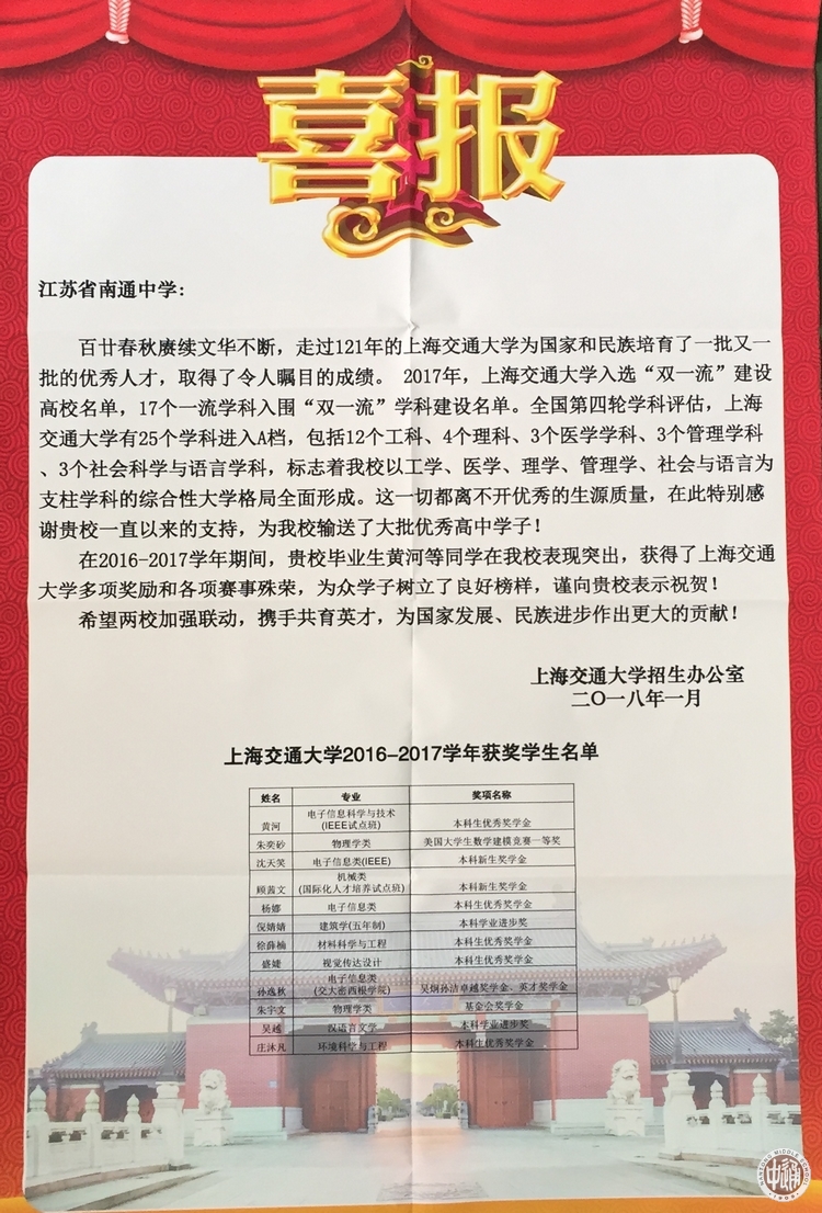 上海交通大学向我校发来喜报 来源:本站原创 发布时间:2018-01-24 11:09:51 浏览次数: 次 【字体:小 大】 近日,上海交通大学向我校发来喜报,对我校对该校一直以来的支持,输送大批优秀高中学子表示衷心的感谢;对我校历届优秀学子在该校取得佳绩、获得殊荣表示诚挚的祝贺;希望今后两校加强联动,携手共育英才,为国家发展、民族进步做出更大的贡献。 分享到: 【打印正文】