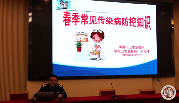 3月26日我校学生处特邀南通市卫生监督所学校卫生监督科卞力锋医师来校作春季常见传染病防控知识讲座。讲座由学生处副主任邱允莉主持,讲座同步向全校各班直播。