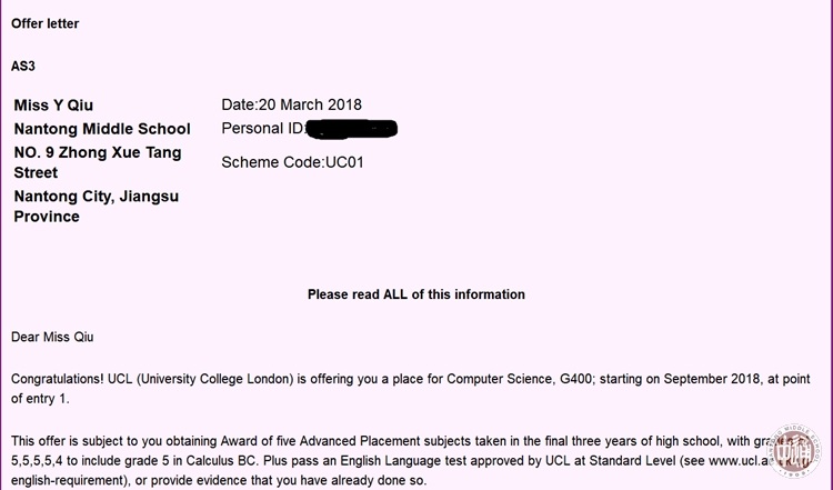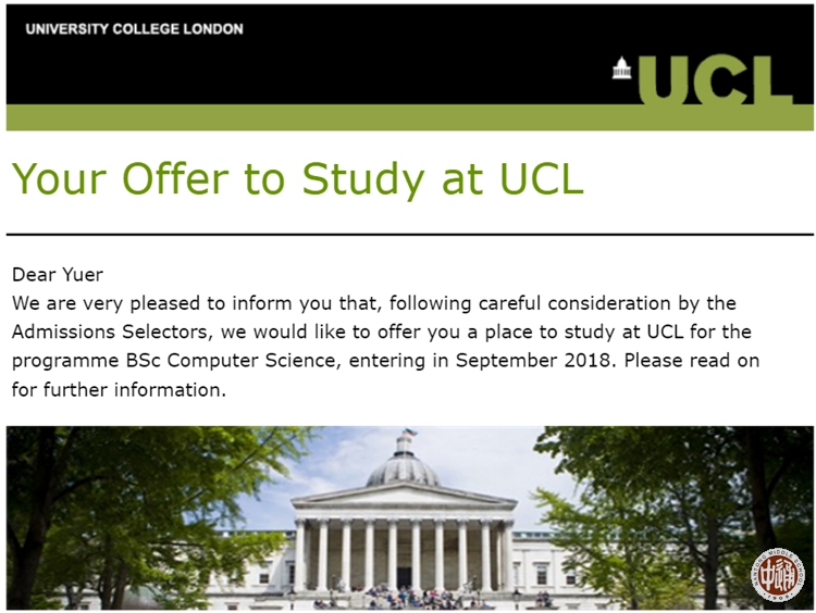 近日,高三学国际班邱雨尔同学获得来自英国G5名校----英国伦敦大学学院的录取通知书,被录取为该校计算机科学专业2018级学生。根据2018QS世界大学排名,英国伦敦大学学院位列第7,是英国顶尖名校之一。