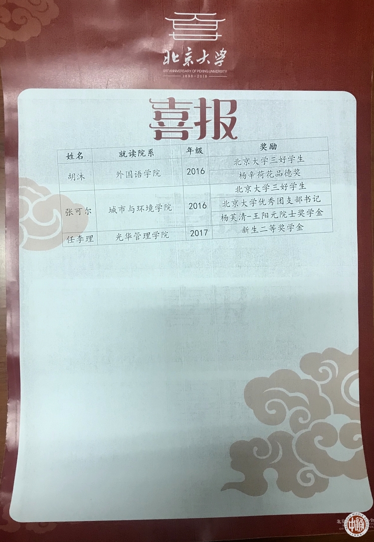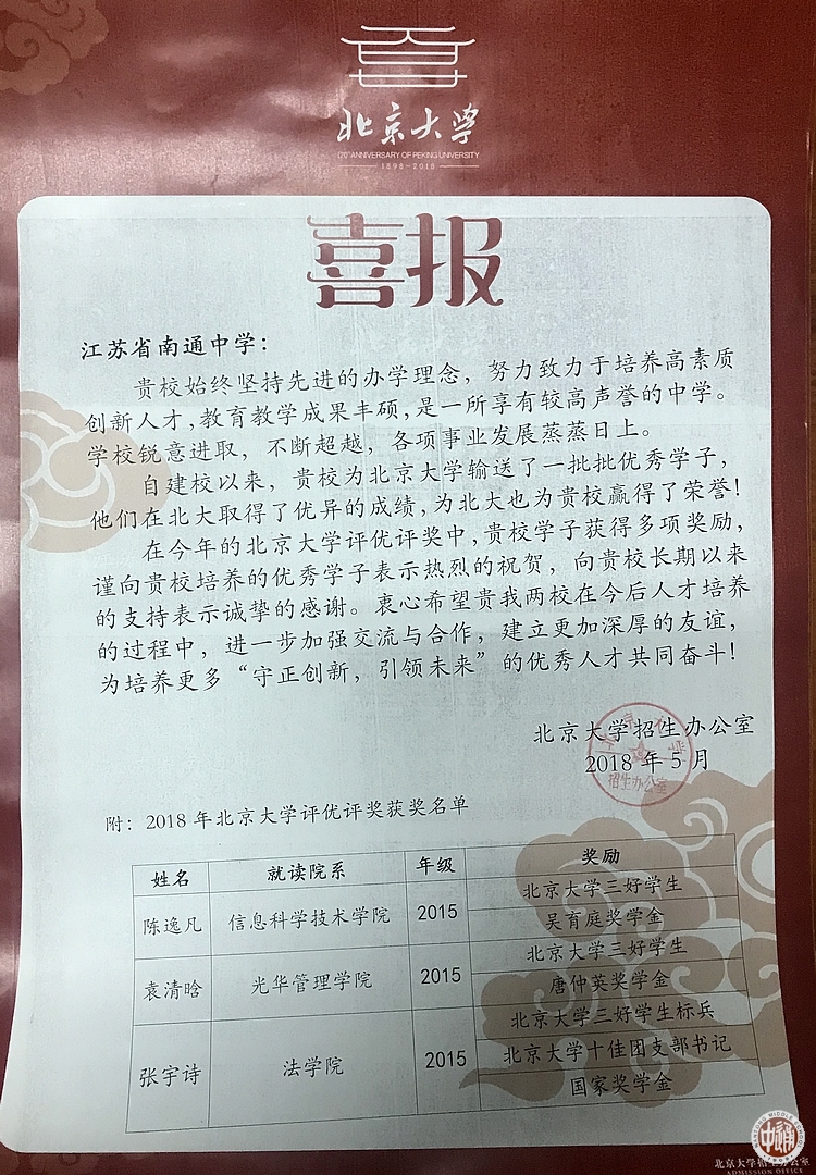 根据喜报,我校2015届优秀毕业生、该校信息科学技术学院陈逸凡荣获“北京大学三好生”“吴育庭奖学金”, 我校2015届优秀毕业生、2015年江苏省高考文科第一名、该校光华管理学院袁清晗荣获“北京大学三好生”“唐仲英奖学金”, 我校2015届优秀毕业生、该校法学院张宇诗荣获“北京大学三好生标兵”“北京大学十佳团支部书记”“国家奖学金”, 我校2016届优秀毕业生、该校外国语学院胡沐荣获“北京大学三好生”“杨辛荷花品德奖”, 我校2016届优秀毕业生、该校城市与环境学院张可尔荣获“北京大学三好生” “北京大学优秀团支部书记”“杨芙清-王阳元院士奖学金”,我校2017届优秀毕业生、该校光华管理学院任李理荣获“新生二等奖学金”。