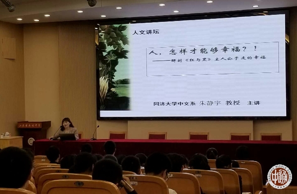 人来到世界上,没有不追求幸福的,上为帝王,下为平民,概莫能外。然而,什么是幸福,如何得到幸福,仍然是一个让大家至今感到困惑的问题。5月7日,我校特邀同济大学人文学院中文系主任、博士生导师朱静宇教授为同学们解答这个疑问,通过解剖《红与黑》的主人公于连从迷到觉的过程,对幸福这个问题进行反思和探讨。