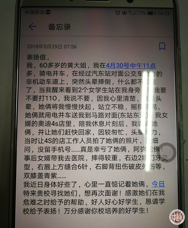 后来黄大妈身体好转,经多方打听找到了两名热心学生,如今特意到学校表示谢意。她特别感谢我校培养的好人好心好学生,希望社会上人与人之间多一些信任,多一些相互帮助,她说在这孩子身上体现出的正能量,应该得到大力弘扬。