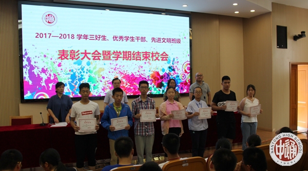 6月30日上午,我校在科学楼三楼报告厅举行学年度优秀学生及先进班集体表彰大会,学生处主任滕旻彦主持并宣读表彰决定(附后),会上学生处邱允莉和潘雪峰副主任分别对本学期班会课、常规、社区及社团工作作了点评,对今后工作提出了解决问题的思路。会上特邀2018届优秀毕业生——省理科第二名范承志同学和省文科第五名石雨辰同学,就如何应对学科竞赛和过好暑期生活分别为学弟学妹作经验介绍。沈惠祥副校长到会讲话,肯定全校师生一学年以来取得的可喜成绩,并就暑假学习生活向同学们提出了希望和要求。