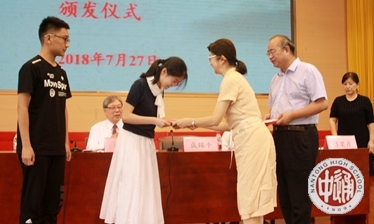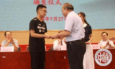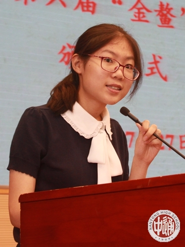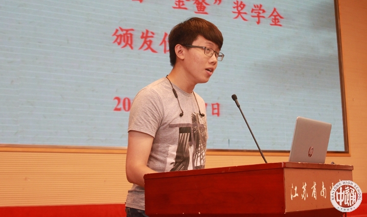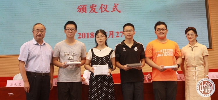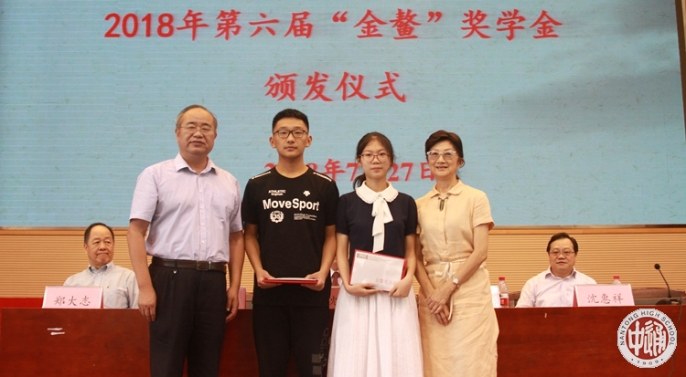 在沈校长宣读“江苏省南通中学第六届‘金鳌奖学金’表彰决定”之后,成校长和程文晋女士为获得第六届“金鳌奖学金”的顾超颖和杨一帆同学颁发证书和奖金,为获得提名奖的范承志、余翰文、姚力、石雨辰同学颁发纪念品。