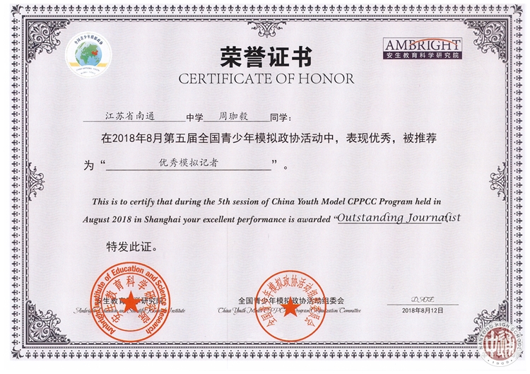 张婧怡、周珈毅、季佳妮、颜闵杰、杨扬和时洋飞六名学生代表江苏省南通中学模拟政协社团参加了全国模拟政协活动,向大会展示了《关于进一步整治老年保健品欺诈和虚假宣传的提案》,并荣获“最佳提案”和“优秀团队”两个团队奖。高三(6)班的张婧怡同学,荣获“优秀新闻发言人”奖;高三(14)班周珈毅同学的表现尤为突出,一人荣获“最佳风采个人”“优秀模拟记者”“优秀模拟政协委员”三个奖项。