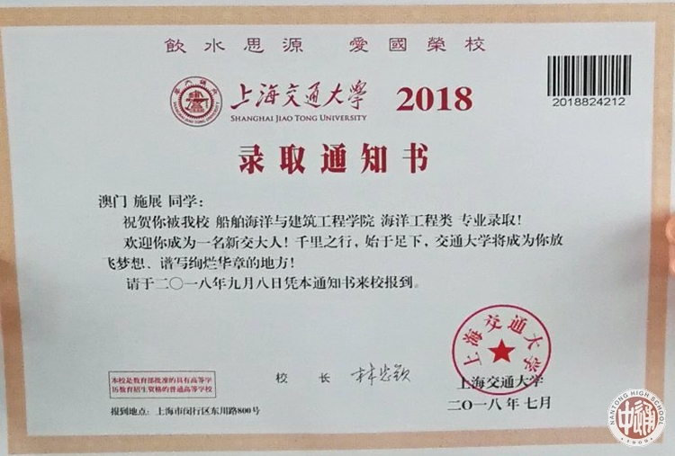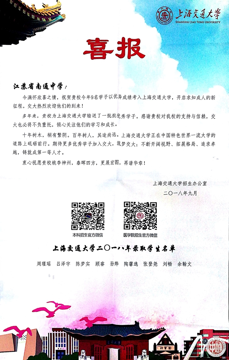 近日,上海交通大学向我校发来喜报,对我校多年来为该校输送一批批优秀学子表示衷心的感谢,期待更多的通中优秀学子能加入交大,筑梦交大,不断开拓视野,追求卓越。