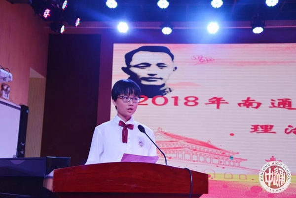 校长成锦平在仪式上讲话,他说朱理治是从南通走出去的老一辈无产阶级革命家,是南通中学办学百年杰出校友的代表,他鼓励获奖学生秉承“理治”精神,以优异的成绩实现自己的人生理想。
