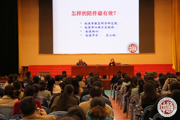 接着,国家二级心理咨询师、南通市教育科学研究院心理教育兼职教研员符小斌老师作了《怎样的陪伴最有效》的主题讲座。讲座从家长与学生如何相处,如何构建良好的家庭环境两个角度入手,将心理学知识应用于生活实际,深入浅出,引人入胜。会后,家长们回到各班班级与班主任及科任教师开展家校交流活动。