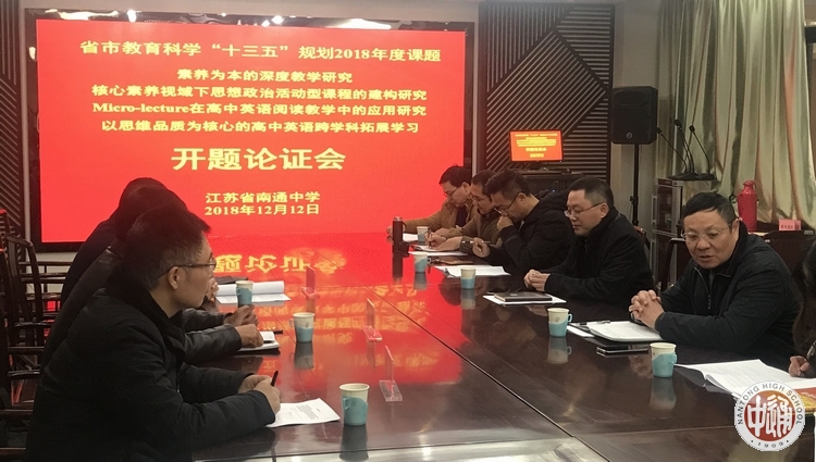 12月12日下午,学校召开省市“十三五”规划2018年度课题开题论证会,论证会邀请通州中学的翟新民、张淳、何忠锋以及本校的周建民4位正高级教师担任评议专家,对陆军老师主持的省级课题“素养为本的深度教学研究”、蒋卫星老师主持的省级课题“核心素养视域下思想政治活动型课程的建构研究”、曹畅和刘忠保老师主持的市级课题“以思维品质为核心的高中英语跨学科拓展学习”以及李建红老师主持的市级课题“Micro-lecture在高中英语阅读教学中的应用研究”进行开题论证。各课题主持人以及课题组核心成员共20多人参加论证会。