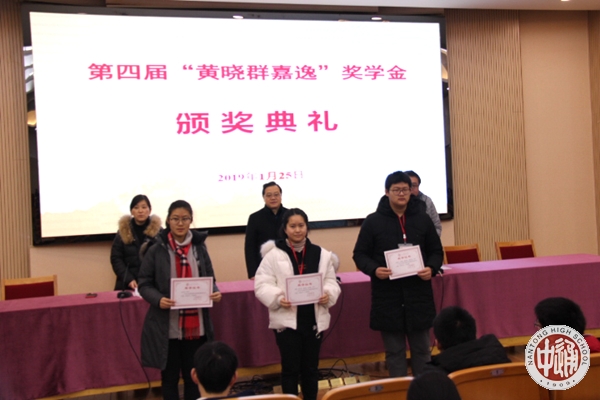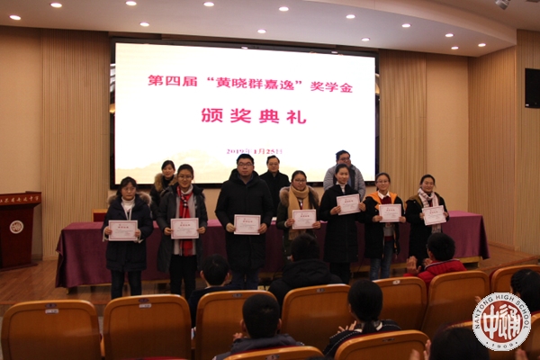 1月25日上午我校隆重举行第四届黄晓群嘉逸奖学金颁奖典礼。学生处滕旻彦主任主持会议,奖学金设立者秦思奕先生、我校副校长沈惠祥到会颁奖并讲话。“黄晓群嘉逸奖学金”由秦思奕先生(南通中学初中92届、高中95届校友)为纪念母亲,感恩母校而设立。黄晓群女士系南通中学63级初中校友,生前为江苏嘉逸医药股份有限公司董事。黄晓群女士在读期间逢十年浩劫,未能完成学业,引为终生遗憾。秦先生为实现母亲遗愿,特以母亲的名义设立该奖学金。