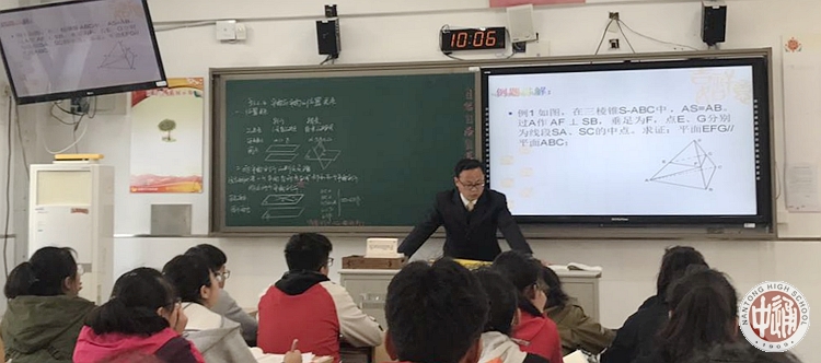 在《平面与平面的位置关系(一)》这一课中,张义成老师先是通过引导学生发现生活中平面与平面位置关系的实例,进而提出核心问题:如何判定两个平面平行?在学生思考过程中,张老师逐步设问、步步为营,提出三个问题串:1.一个平面内的一条直线平行于另一平面能否推出两个平面平行?2.一个平面内的两条直线平行于另一平面能否推出两个平面平行?3.一个平面内无数条直线平行于另一平面能否推出两个平面平行?通过问题串的形式激发学生求知欲和探索欲,最终得出面面平行的判定定理。紧接着,张老师通过例题以及例题的三个变形形式,合理设置难度梯度,引导学生思考问题,并通过学生板书、教师总结的方式提高学生书写的严谨性和规范性。最后,张老师带同学们总结本课知识点和重难点,并以一道思考题结束本课,承上启下,为下节课的内容作了完美的铺垫。