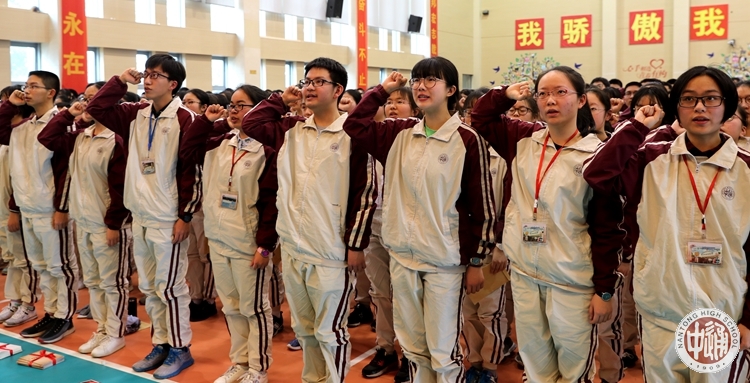十八岁,因为彼此的陪伴,所以无惧黑暗。活动现场,卢芳菲、孙昊康、尤菁、陆徐东同学带来朗诵《拥抱我们的十八岁》,表达了“不辜负往昔期望,不懈怠今朝责任,不放弃明日理想”的成人心声。我校2018届校友、现就读于北京大学的石雨辰学姐也特意赶回母校,与学弟学妹们分享了自己成长的故事,鼓励大家努力成为自己喜欢的模样。在学姐的带领下,全体高三学子满怀豪情,面向国旗,许下庄重的誓言。相信榜样的力量定能引领高三学子向着自己的高考目标和人生理想不断迈进。