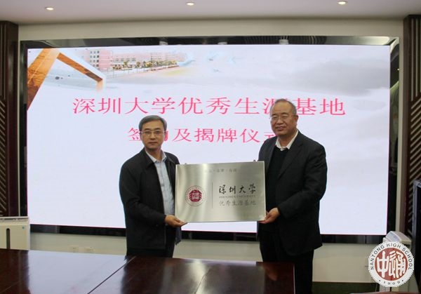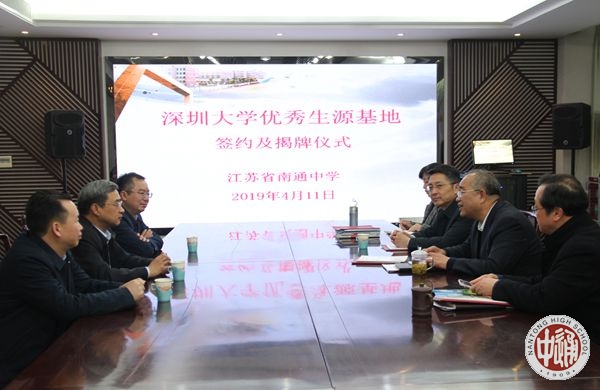 4月11日下午,深圳大学优秀生源基地签约及授牌仪式在我校科学楼二楼会议室举行,深圳大学党委常委、副校长王晖介绍深圳大学概况;我校成锦平校长向来宾介绍我校办学概况,两校就新高考改革、拔尖创新人才培养等方面进行深入交流。深圳大学党委常委、组织部统战部部长戴纪锋、深圳大学招生办公室主任李智军,南通市教育考试院吉海波院长、我校沈惠祥副校长、学生处滕旻彦主任参加了活动。
